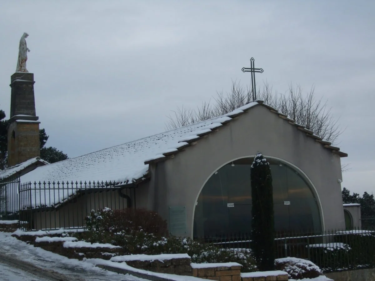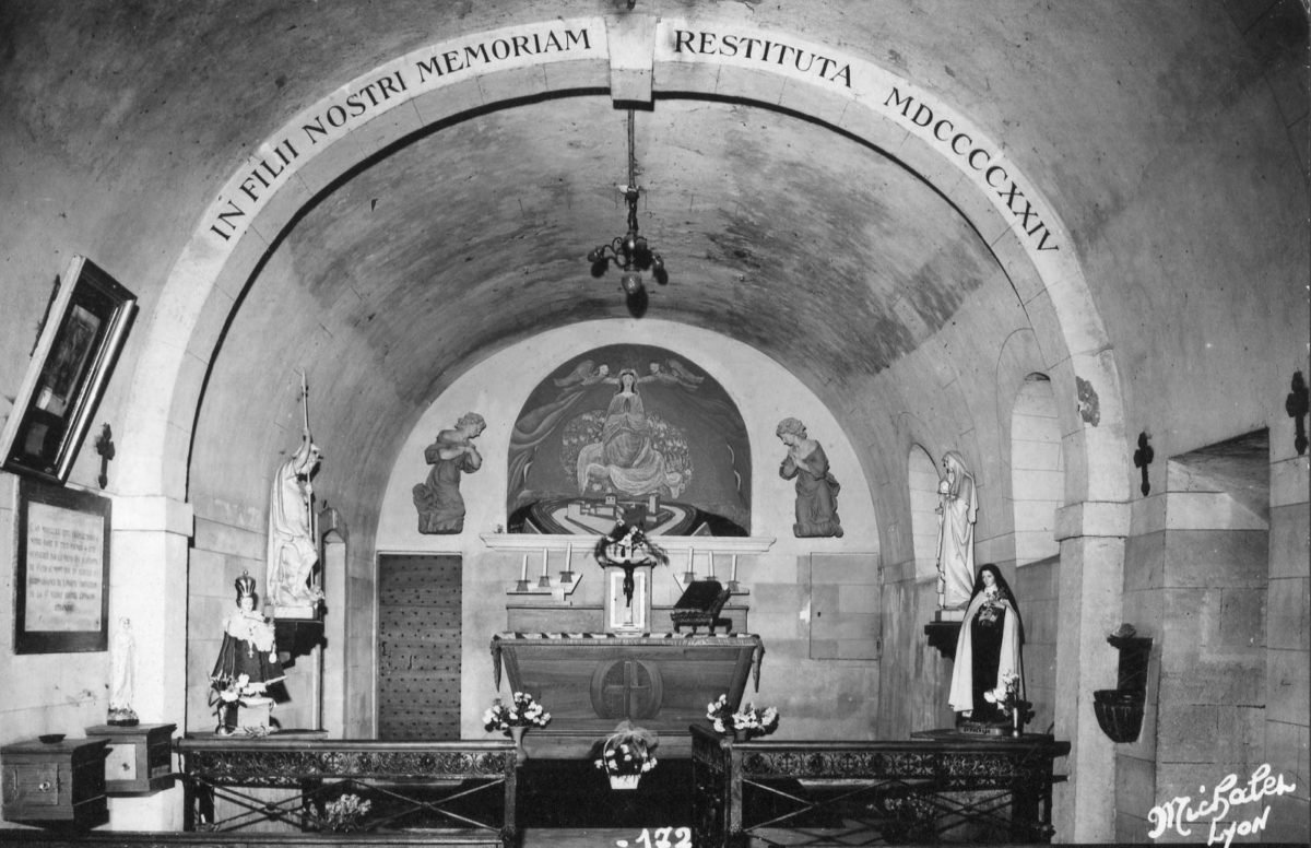 De la première chapelle Marie Reine des Cieux il ne reste rien si ce n’est qu’un bénitier en pierre grise des Monts d’or, décoré d’un phénix, que frère Henri aurait rapporté de l’abbaye de l’île Barbe.