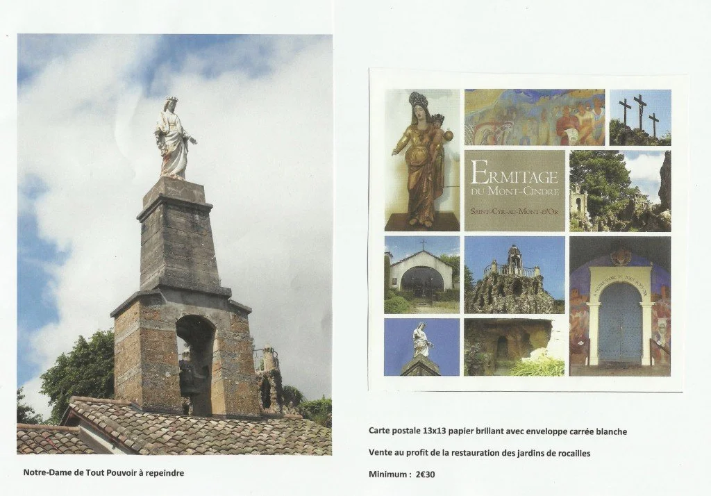 Dans une propriété privée proche du plateau du Mont Cindre, des statues et rocailles d’un faux ermitage subsistent encore aujourd’hui alors que la chapelle a disparu.