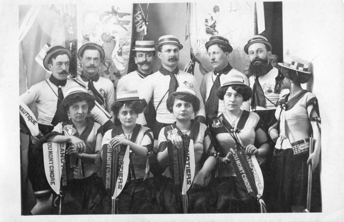 En 1910, comme en témoigne la photographie ci-dessus, un groupe de joyeux lurons lyonnais voulut concrétiser le mythique lac en créant un tout aussi mythique « CLUB NAUTIQUE DES CANOTIERS DU MONT CINDRE ». Les dames portent en bandoulière une petite bourriche en osier sur laquelle on peut lire : « goujons ». Ils sont tous très sérieux et ont préparé avec beaucoup de soin cette prise de vue : costumes, rames et bannières dont on ne connaît pas,hélas, la symbolique des animaux représentés (une oie et une grenouille enlacées, un chat au sommet d’une colline et d’autres moins visibles). On imagine que la petite troupe faisait un bon repas dans l’un ou l’autre des restaurants.