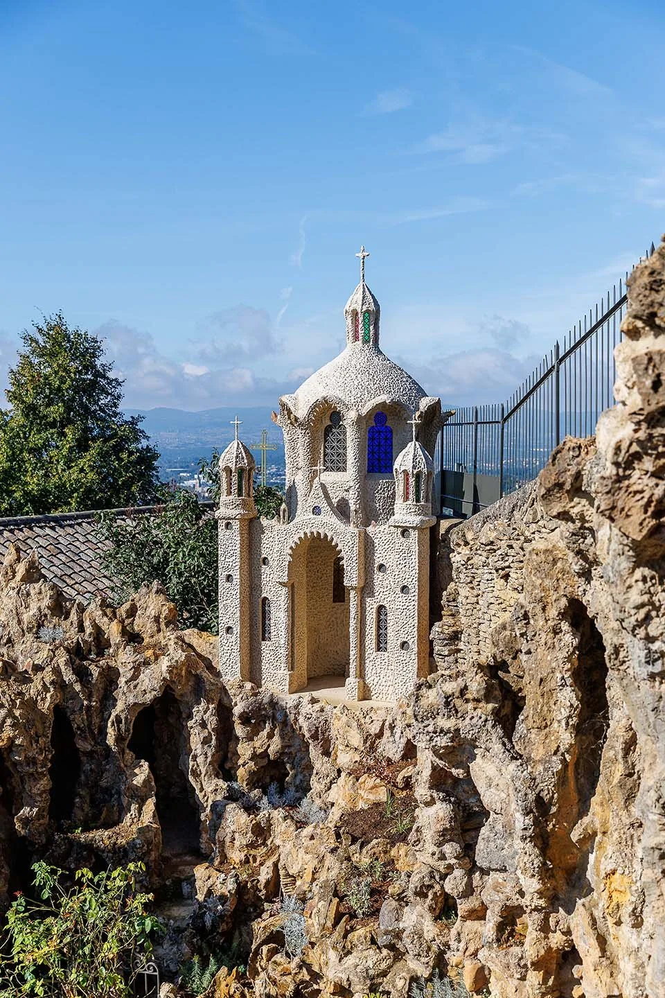 Un an avant le facteur Cheval, mais connaissant bien les jardins de rocailles à la mode depuis longtemps dans les belles propriétés, Damidot ramasse les cailloux en bordure des champs et surtout les vignes épierrées. Il créé des niches, des grottes, des bassins, se souvient de Bethléem et de sa crèche, de Nazareth et de la visitation de Marie dans la maison à la fenêtre rouge, de St François d’Assise et lui dédie une petite chapelle… Et le Mont des Oliviers se dresse sur la carrière « plus près du ciel, plus près de Dieu » et surtout avec une vue exceptionnelle, d’autant que les coteaux sont couverts de vignes et aucun arbre ne vient cacher l’horizon. Il récupère deux escaliers métalliques en colimaçon d’une bibliothèque pour accéder à son belvédère.